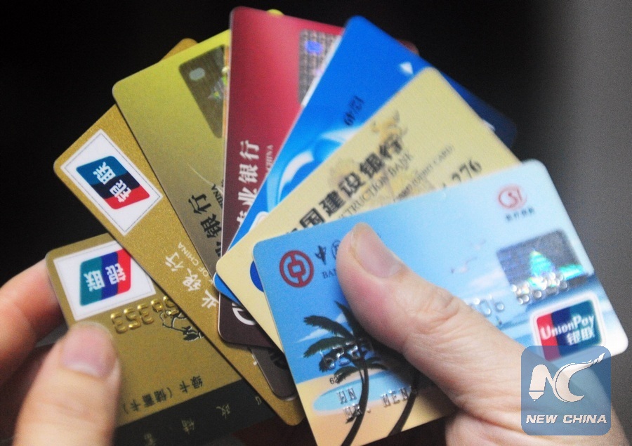 File photo taken on Sept. 25, 2011 shows a customer displays bank cards in Qionghai, south China's Hainan Province. (Xinhua/Meng Zhongde)