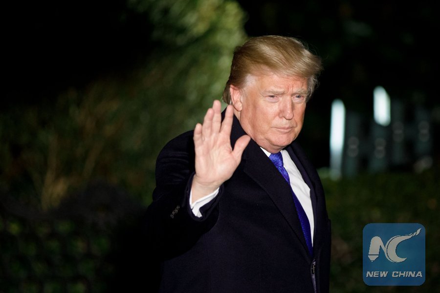 U.S. President Donald Trump leaves the White House for the World Economic Forum in Davos Switzerland, in Washington D.C., the United States, on Jan. 24, 2018. (Xinhua/Ting Shen)