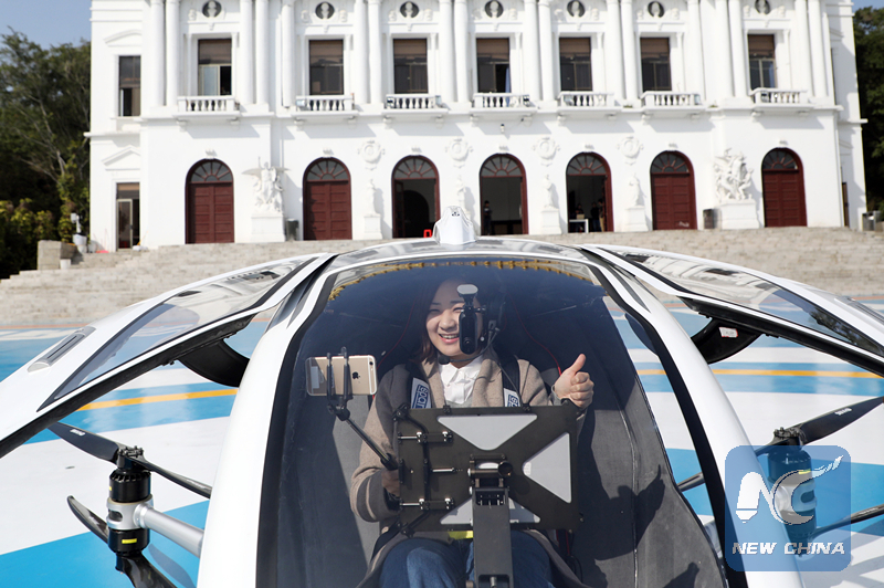A passenger is on board the Ehang drone in the test flight. (Xinhua photo/Chen Ji)