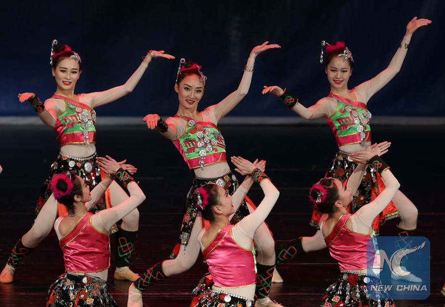 Actresses from China's Guangxi Song and Dance Theater perform to celebrate the Chinese Spring Festival and commemorate the 60th anniversary of the establishment of diplomatic relations between China and Algeria at the Opera of Algiers, in Algerian capital of Algiers, on Feb. 6, 2018. (Xinhua photo) (srb)