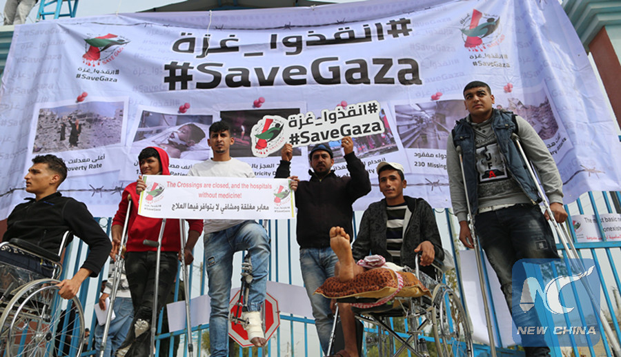 GAZA, Feb. 8 (Xinhua) -- Dozens of Palestinian patients including the disabled protested on Thursday at the Erez border crossing in northern Gaza against Israel's 11-year-long siege on the coastal enclave.