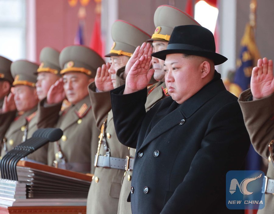 This picture provided by Korean Central News Agency (KCNA) on Feb. 9, 2018 shows the top leader of the Democratic People's Republic of Korea (DPRK) Kim Jong Un attending the military parade marking the 70th anniversary of the founding of Korean People's Army in Pyongyang, capital of the DPRK. (Xinhua/KCNA)