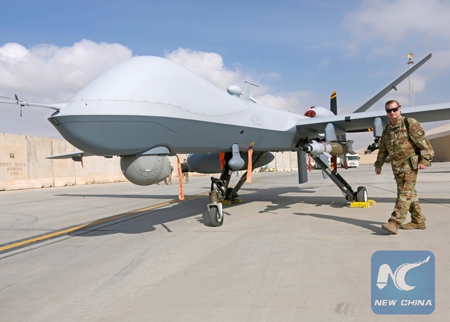 U.S. Air Force officer passes in front of a MQ-9 Reaper drone, one of a squadron that has arrived to step up the fight against the Taliban, at the Kandahar air base, Afghanistan Jan. 23, 2018. (Xinhua/REUTERS)