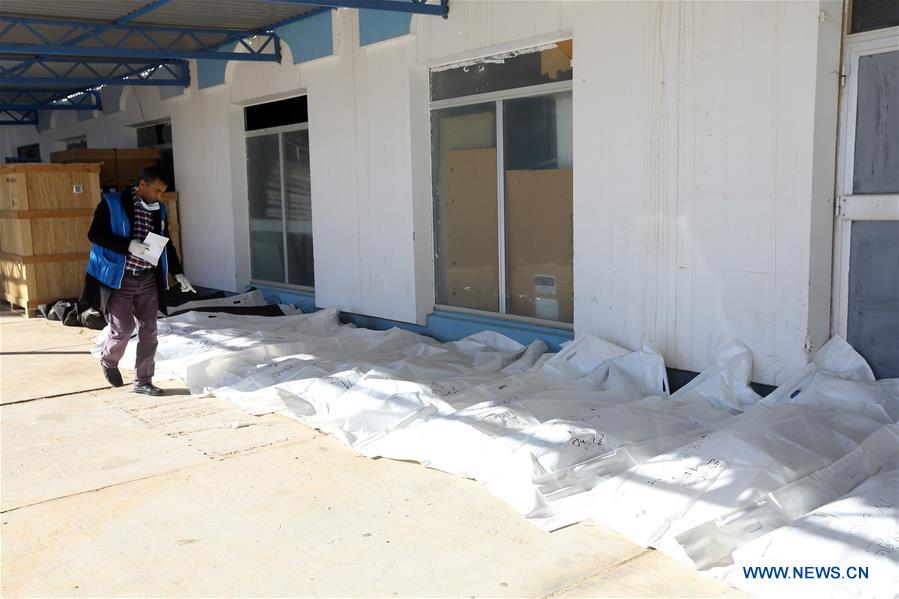 Bodies of illegal immigrants are seen at a hospital in the city of Bani Walid, some 180 km southeast of Tripoli, capital of Libya, on Feb. 14, 2018. A truck carrying illegal immigrants of different African nationalities crashed in Bani Walid on Wednesday, killing 21 and wounding 75 others, a local medical source told Xinhua. (Xinhua/Hamza Turkia)