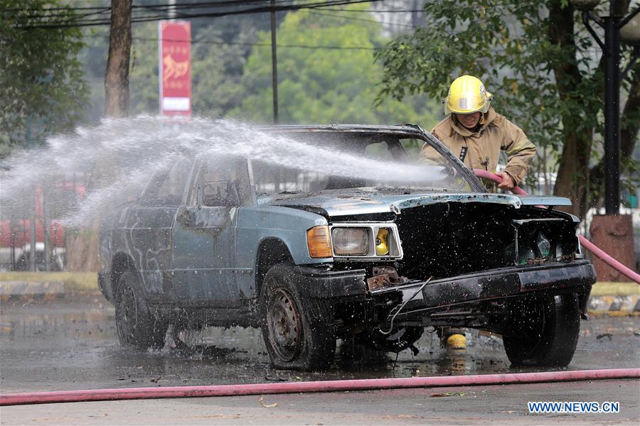 A firefighter extinguishes the fire from a burning car during the Nationwide Simultaneous Earthquake Drill in Quezon City, the Philippines, Feb. 15, 2018. (Xinhua/Rouelle Umali)?