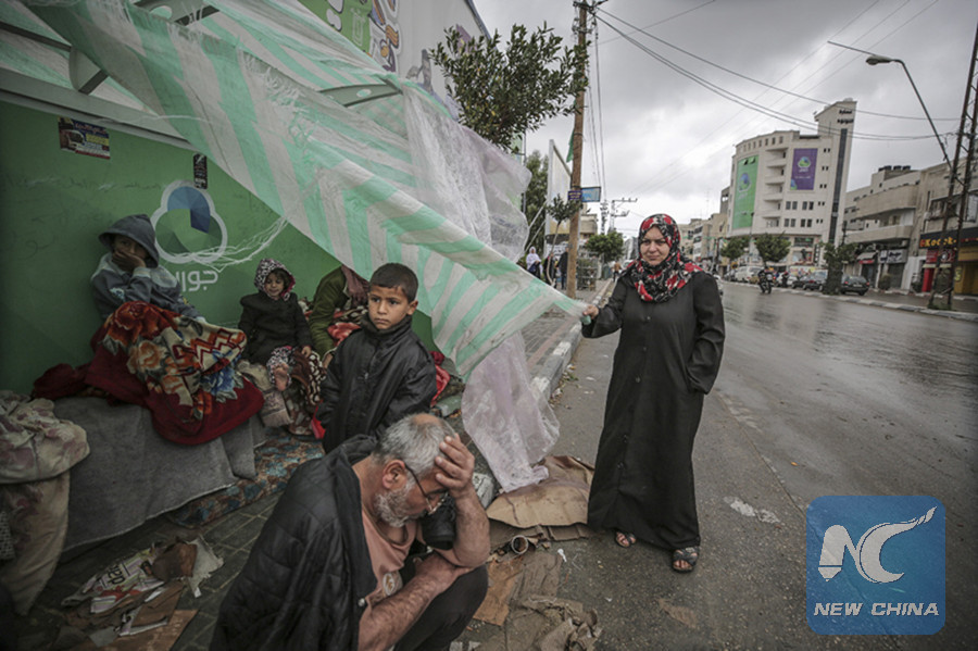 Palestinian homeless man Fadel al-Diri and his 10-member family live on a streetside tent after being kicked out of their previous home. (Xinhua)