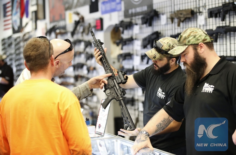 People purchase firearms in a gun shop in Las Vegas, the United States, on Oct. 4, 2017. (Xinhua/Wang Ying)