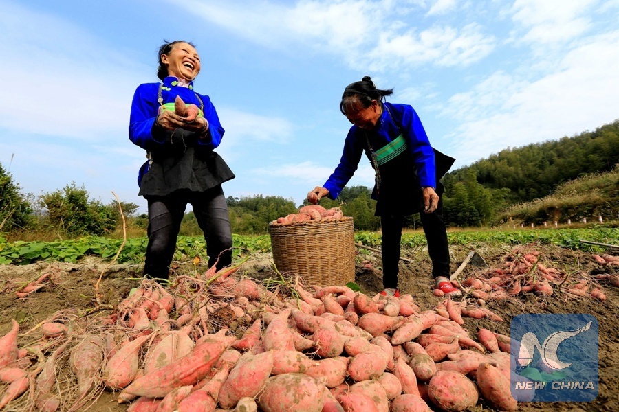 Farmers collect sweet potatoes in Santuan Village, Miao Autonomous County of Rongshui, south China's Guangxi Zhuang Autonomous Region, Oct. 24, 2017. (Xinhua/Long Tao)