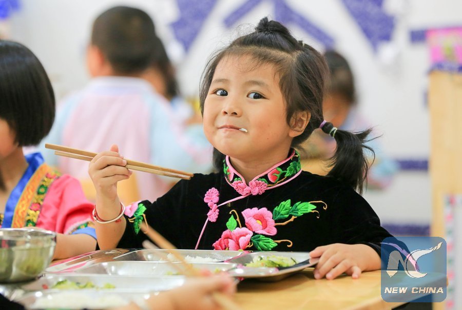 File photo taken on Sept. 6, 2017 shows that Pan Chengyue, a 4-year-old girl of Miao ethnic group, takes free lunch at the Kaihuai Community No. 13 Kindergarten, which was newly built for children relocated from poverty-stricken areas, in Kaili City, Miao and Dong Autonomous Prefecture of Qiandongnan, southwest China's Guizhou Province. (Xinhua/Wu Jibin)