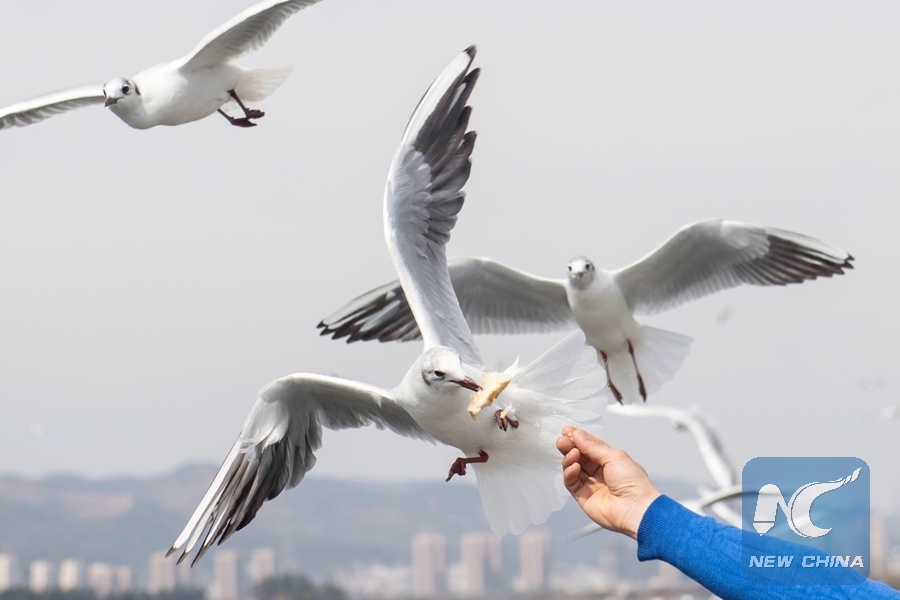 A black-headed gull takes food near the Dianchi Lake in Kunming, southwest China's Yunnan Province, Feb. 21, 2018. Every year in autumn and winter, black-headed gulls flew to Kunming for warmer weather. (Xinhua/Hu Chao)