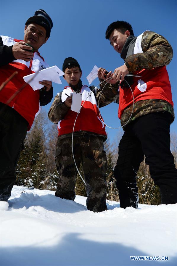 Tiger conservation experts keep track of their routes during a Siberian tiger conservation skills contest in Suifenhe, northeast China's Heilongjiang Province, March 5, 2018. Twenty tiger conservation teams from China and Russia had competed in the contest in events including wildlife law enforcement, trap detachment, setting-up and debugging of infrared cameras, as well as keeping record of the habitat environment. (Xinhua/Wang Kai)
