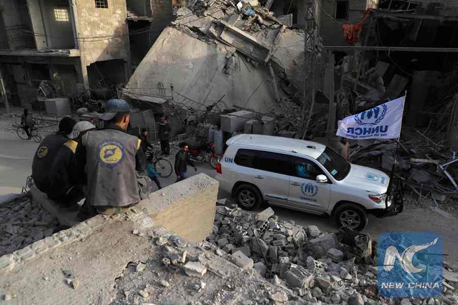 A vehicle from the United Nations Refugee Agency UNHCR drives in Douma in the Syrian rebel enclave of Eastern Ghouta on March 5, 2018 on the outskirts of Damascus. An international convoy entered Syria's rebel enclave of Eastern Ghouta to deliver much-needed aid. (Xinhua/AFP)