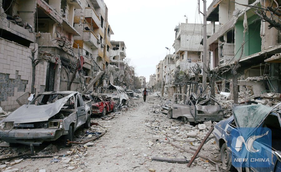 Damaged cars and buildings are seen in the besieged town of Douma, Eastern Ghouta, Damascus, Syria Feb. 25, 2018. (Xinhua/REUTERS)