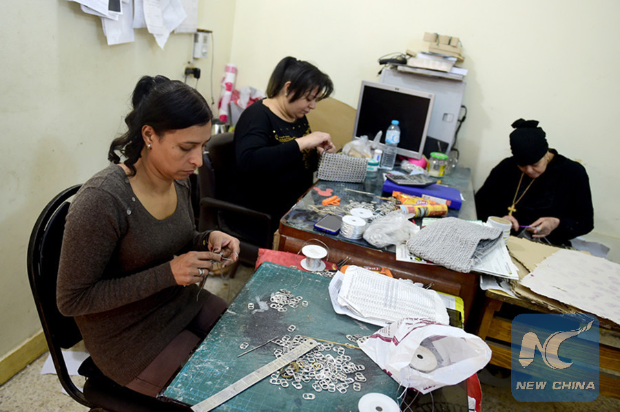 Egyptian women make handicrafts from recycled materials at an APE workshop in Mokattam area of Cairo, Egypt, on March 7, 2018. (Xinhua/Zhao Dingzhe)