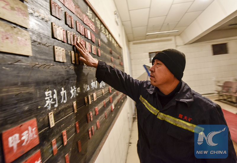 Cheng Zhongyun puts his name tag on the blackboard before heading for work. (Xinhua/Zhao Ge)