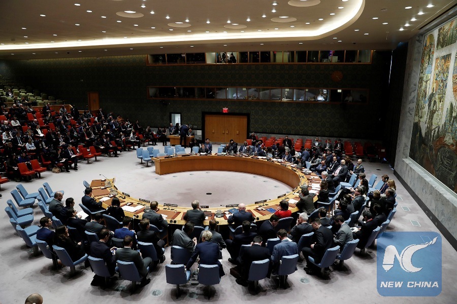 Photo shows a general view of a Security Council meeting on the poisoning of a former Russian spy, at the United Nations headquarters in New York, March 14, 2018. (Xinhua/Li Muzi)