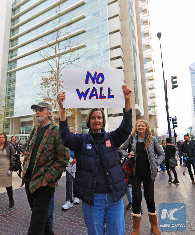 SAN DIEGO/MEXICO CITY, March 15 (Xinhua) -- Chanting "Build bridges not walls," hundreds of protesters in downtown San Diego, California, greeted Donald Trump's maiden trip as U.S. president to the "Golden State" bordering Mexico.