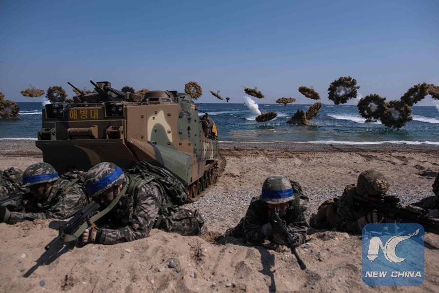 File Photo: South Korean and U.S. soldiers take a position during an annual joint military landing exercise in Pohang, on South Korea's southeast coast, on March 12, 2016. (Xinhua/AFP)