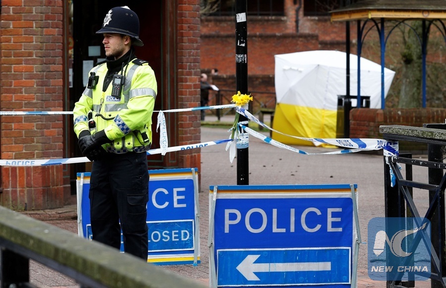 A police officer stands on duty at a cordon near a bench covered in a protective tent at The Maltings shopping centre in Salisbury, southern England, on March 12, 2018, where a man and woman were found critically ill on March 4, after being apparently poisoned with what was later identified as a nerve agent sparking a major incident. (Xinhua/AFP)