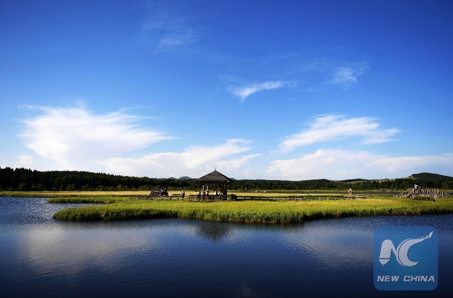 The level of PM2.5 in Beijing has dropped to its lowest level since 2013 when the national air pollution control campaign began. Across the country, average PM2.5 density in 338 cities fell by 6.5 percent last year. Photo taken on July 11, 2017 shows tourists visiting the Qixing Lake Scenic Area of the Saihanba State Forest Park in Weichang Man and Mongolian Autonomous County of Chengde City, north China's Hebei Province. (Xinhua/Wang Xiao)