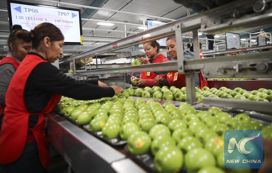 File Photo: Workers put granny smith apples into trays on a packing line at a packing house of Auvil Fruit Company in Wenatchee, Washington state, the United States, on Nov. 3, 2017. (Xinhua/Wang Ying)