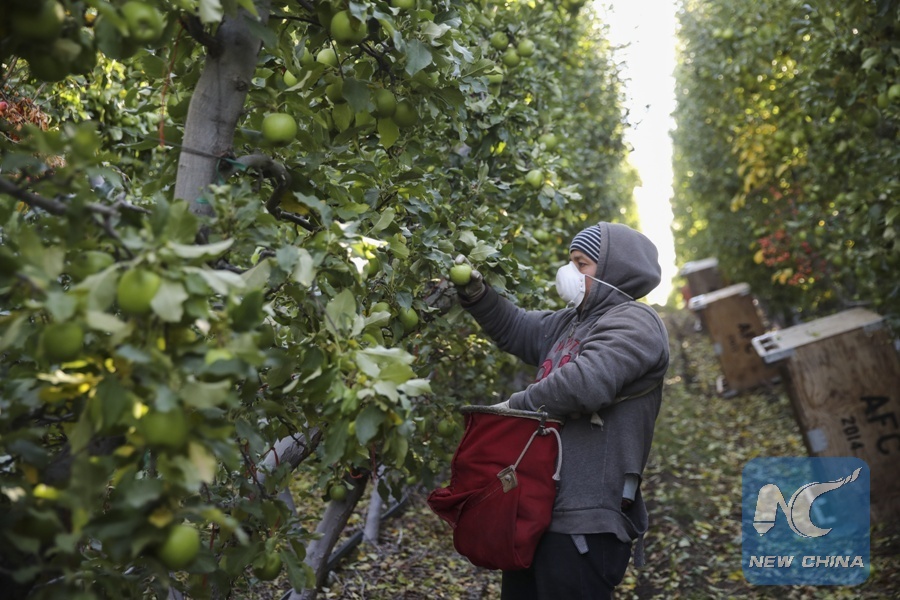 A worker picks granny smith apples in an apple orchard of Auvil Fruit Company in Wenatchee, Washington state, the United States, on Nov. 3, 2017. (Xinhua/Wang Ying)
