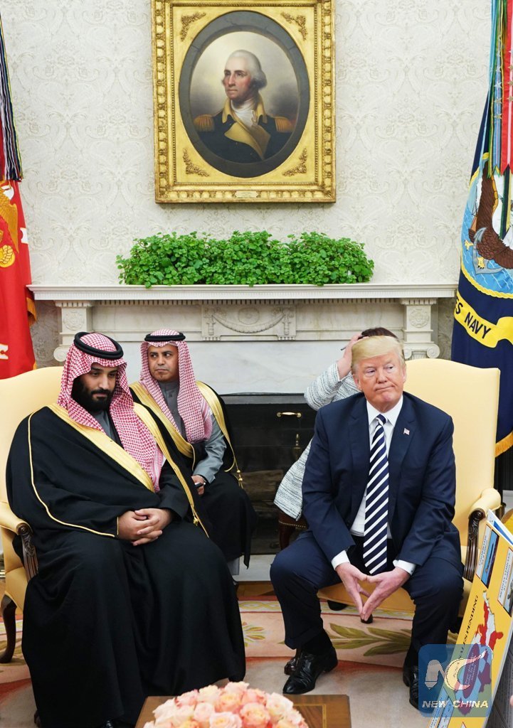 File Photo: U.S. President Donald Trump (R) meets with Saudi Arabia's Crown Prince Mohammed bin Salman in the Oval Office of the White House on March 20, 2018 in Washington, D.C. (Xinhua/AFP)