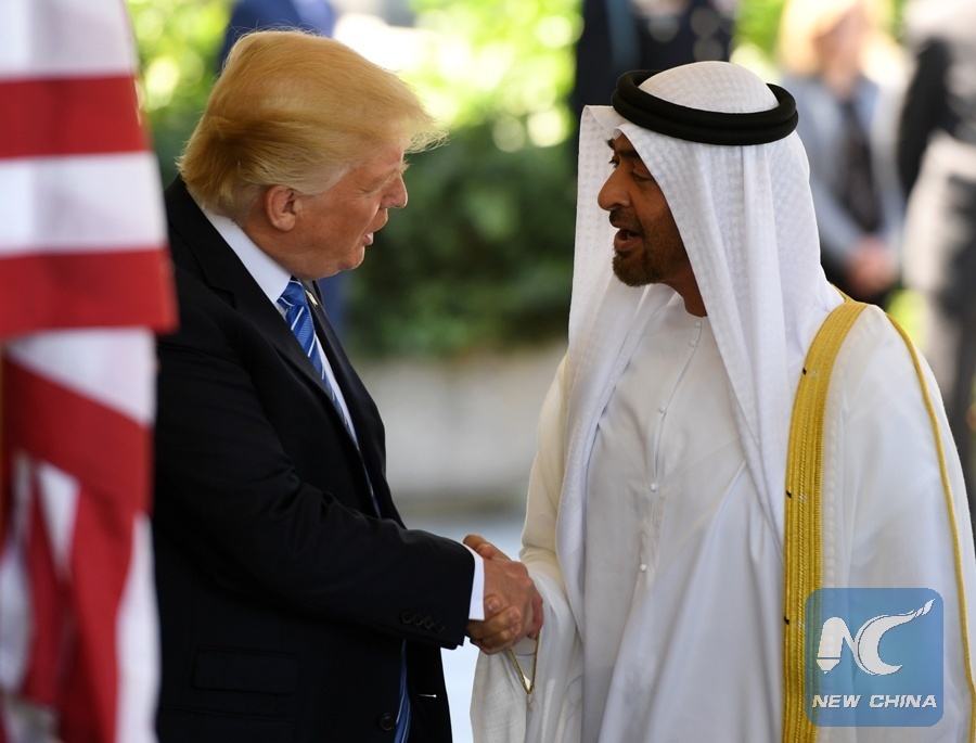 File Photo: U.S. President Donald Trump (L) welcomes Sheikh Mohamed bin Zayed Al-Nahyan, Abu Dhabi Crown Prince of the United Arab Emirates (UAE), at the White House in Washington D.C., the United States, on May 15, 2017. (Xinhua/Yin Bogu)