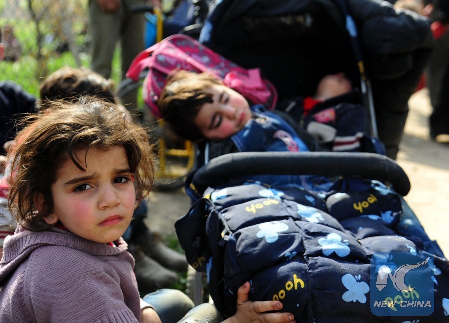 Children wait to be transferred to a safe shelter from the Hamouriyeh area in Eastern Ghouta of Damascus, Syria, on March 17, 2018. As many as 30,000 civilians evacuated from rebel-held areas in the Syrian capital Damascus' Eastern Ghouta area on Saturday, state news agency SANA reported. (Xinhua/Ammar Safarjalani)