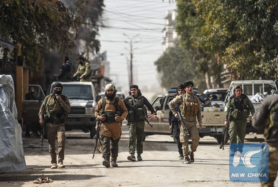 (File photo)Turkish-backed Syrian Arab fighters walk in the streets after seizing control of the northwestern Syrian city of Afrin from the Kurdish People's Protection Units (YPG) on March 18, 2018. (AFP photo)