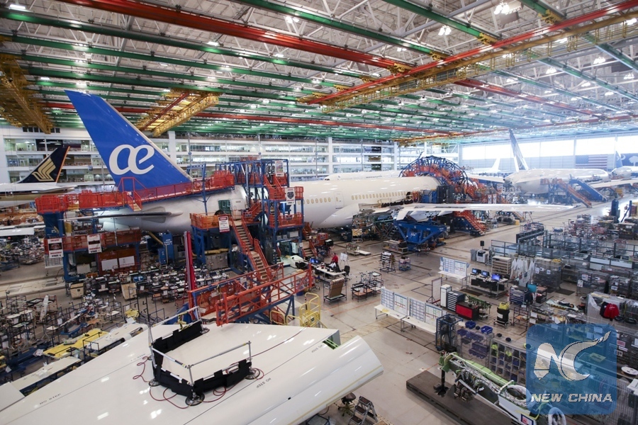 Photo taken on Jan. 26, 2018 shows interior of the final assembly building in Boeing South Carolina in North Charleston, South Carolina of the United States. (Xinhua/Wang Ying)