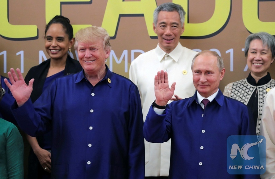 U.S. President Donald Trump and Russian President Vladimir Putin take part in a family photo at the APEC summit in Danang, Vietnam Nov. 10, 2017. (Xinhua/REUTERS)