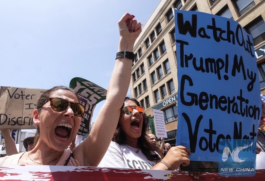 People holding placards participate in the March for Truth rally in Los Angeles, the United States, on June 3, 2017. Rallies and marches took place across the country on Saturday to call for investigation into possible Russian interference in the U.S. election and the links between Donald Trump's administration and Russia. (Xinhua/Zhao Hanrong)