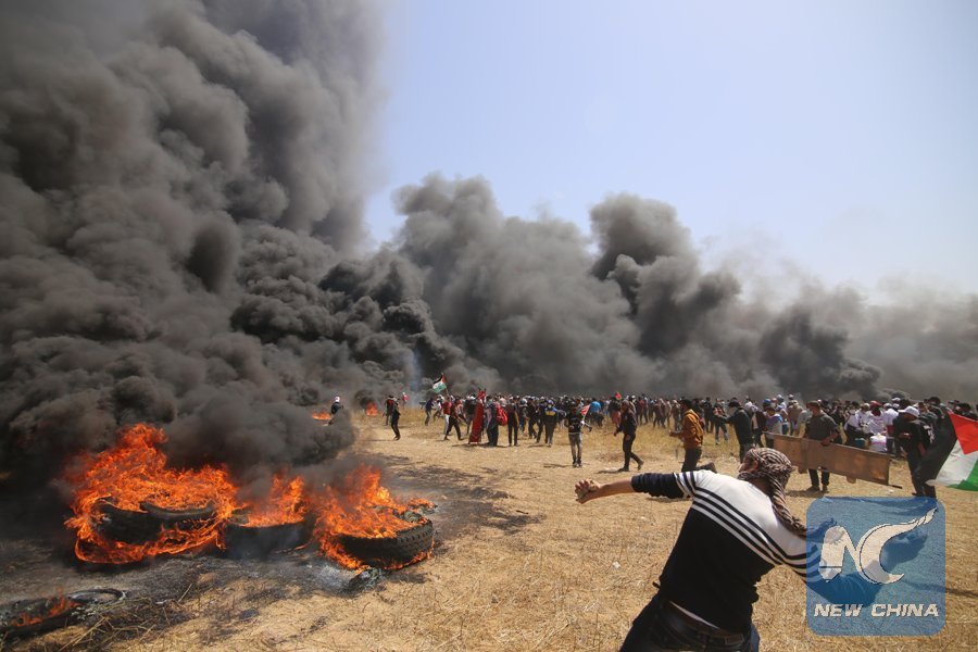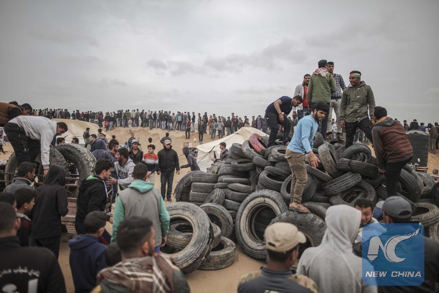 Palestinian protestors pile up tyres for burning them during a clash with Israeli soldiers along the Gaza Strip-Israel border, east of the south Gaza Strip city of Khan Yunis, April 3, 2018. (Xinhua/Wissam Nassar)