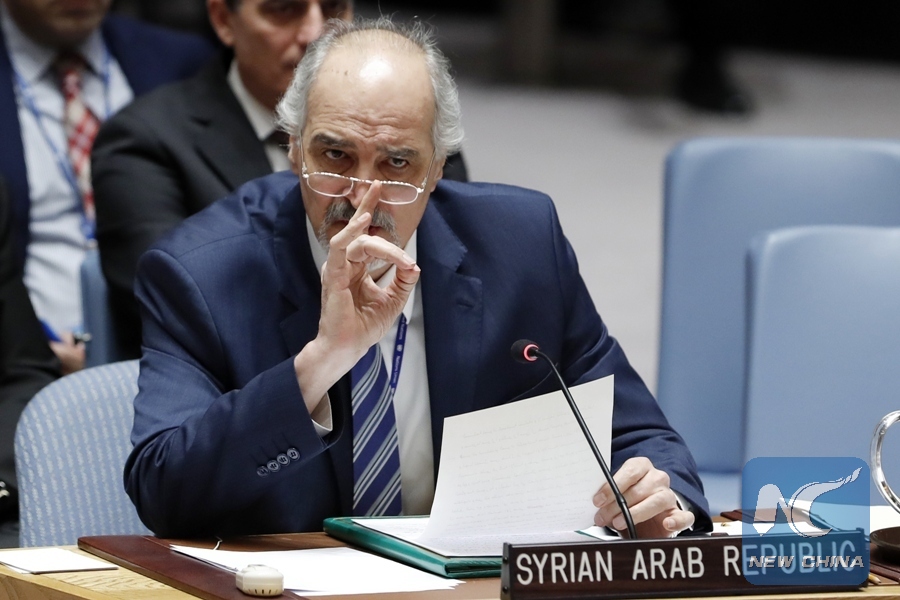 Syrian Ambassador to the United Nations Bashar Ja'afari (front) addresses the UN Security Council meeting on the situation in Syria at the UN headquarters in New York, April 9, 2018. The Security Council held an emergency session on the situation in Syria, particularly after reports of the use of chemical weapons over the weekend in rebel-held Douma near the capital city of Damascus. (Xinhua/Li Muzi)