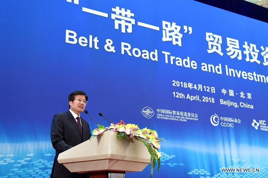 Gao Yunlong, vice chairperson of the 13th National Committee of the Chinese People's Political Consultative Conference (CPPCC) and chairman of the All-China Federation of Industry and Commerce, delivers a speech at the Belt & Road Trade and Investment Forum in Beijing, capital of China, April 12, 2018. (Xinhua/Gu Chenxi)