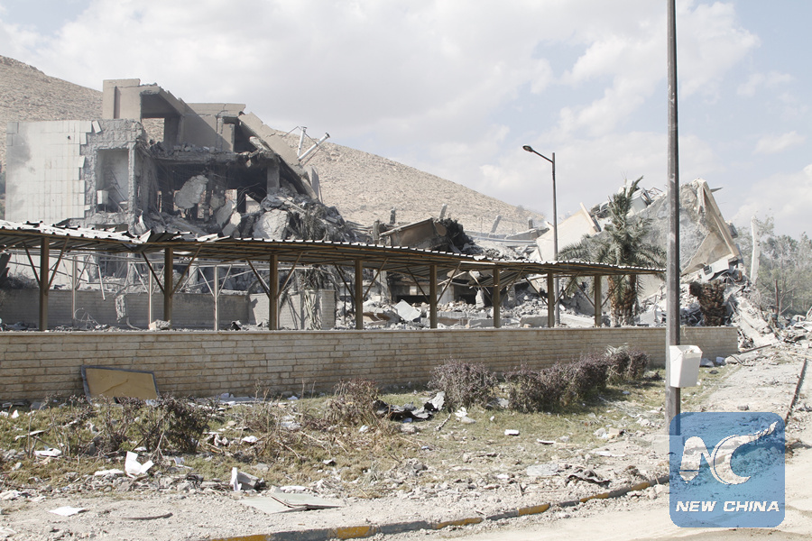 Photo taken on April 14, 2018 shows relics of the Scientific Research Center in the Barzeh neigborhood of northeast of Damascus, after United States, Britain and France carried out a wave of joint airstrikes on Syrian military facilities. (Xinhua/Monsef Memari)