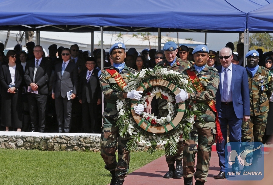 Michael Beary (2nd L, front), head of Mission and Force Commander of United Nations Interim Force in Lebanon (UNIFIL), lays a wreath at the UNIFIL cenotaph to pay tribute to the fallen peacekeepers during a ceremony to mark the 40th anniversary of the establishment of UNIFIL in Naqoura, Lebanon, March 19, 2018. (Xinhua/Bilal Jawich)