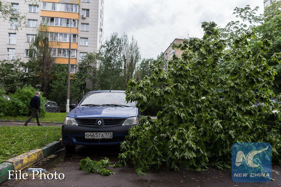 The fallen branches of trees are seen by a car after a storm in Moscow, Russia, on May 29, 2017. (Xinhua/Evgeny Sinitsyn)