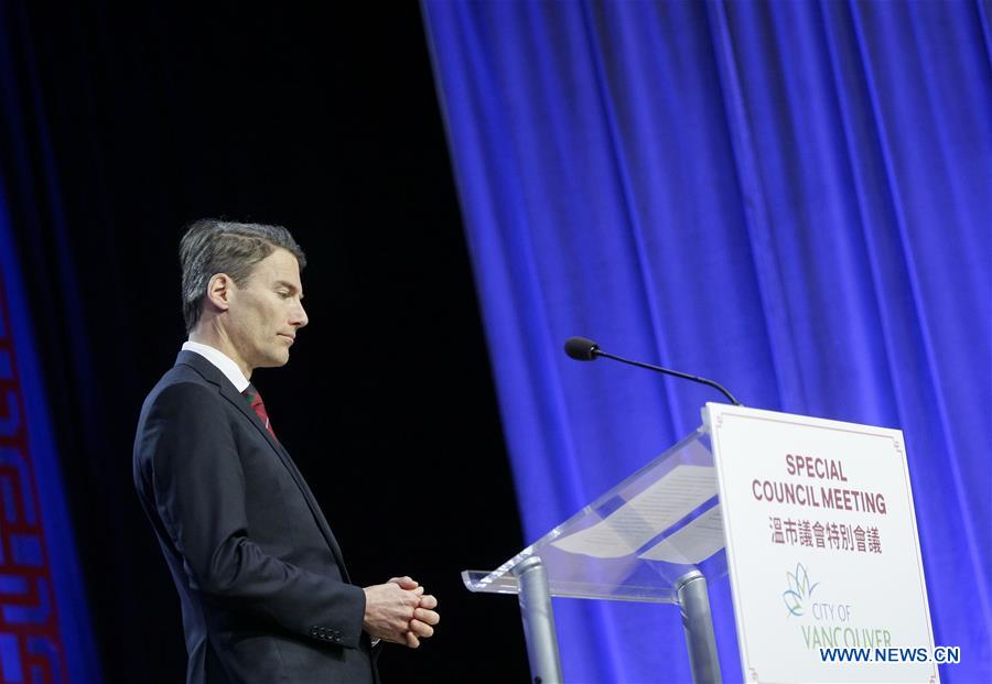 Vancouver Mayor Gregor Robertson issues an apology at a special City Council session in Vancouver, Canada, on April 22, 2018. Hundreds of Vancouverites crammed into the city's Chinese Cultural Center on Sunday to witness the city government's apology for decades of history of racism against Canadian citizens of Chinese descent. (Xinhua/Liang Sen)