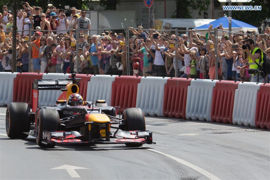 Formula One Red Bull driver Max Verstappen performs during a car show to celebrate the International Workers' Day in downtown Budapest, Hungary, on May 1, 2018. (Xinhua/Attila Volgyi)