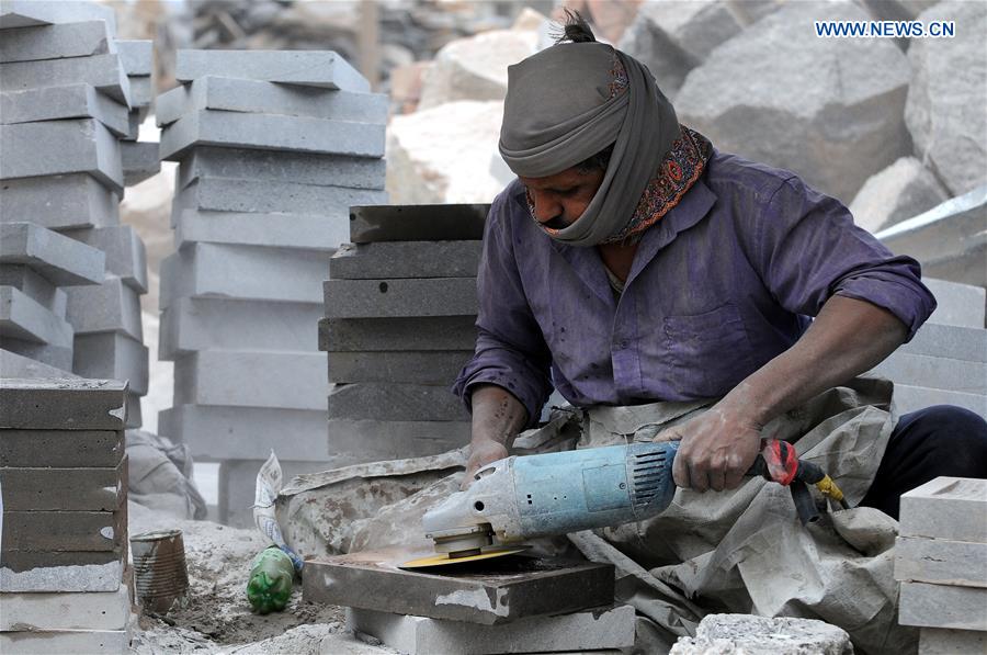 A Yemeni worker cuts stones at a stone workshop at the International Workers' Day in Sanaa, Yemen, on May 1, 2018. (Xinhua/Mohammed Mohammed)