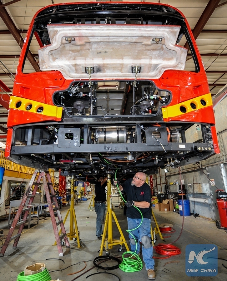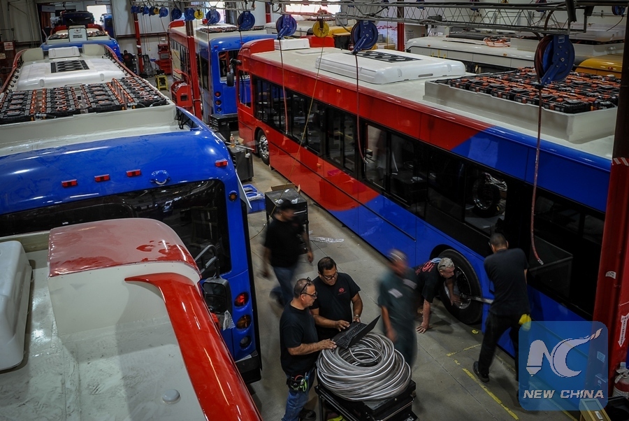 File photo taken on Sept. 23, 2016 shows people working at a BYD electric vehicle plant in Lancaster, California, the United States. (Xinhua/Zhang Chaoqun)