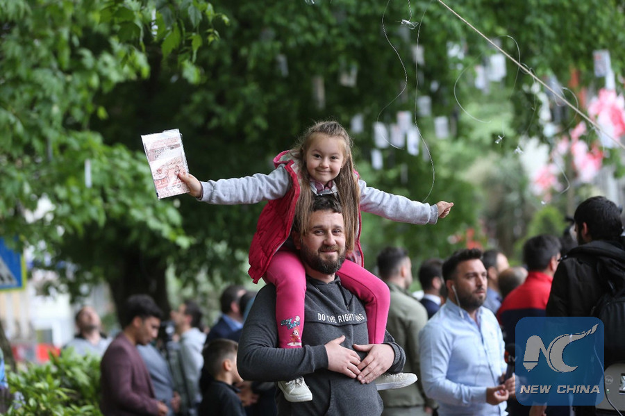 A girl (top) holds a book at Kocaeli book fair, Turkey, on May 4, 2018. A total of 20,000 books appeared on trees across Turkey's northwestern city of Kocaeli on Friday as part of a book fair there. (Xinhua/Kocaeli Municipality)