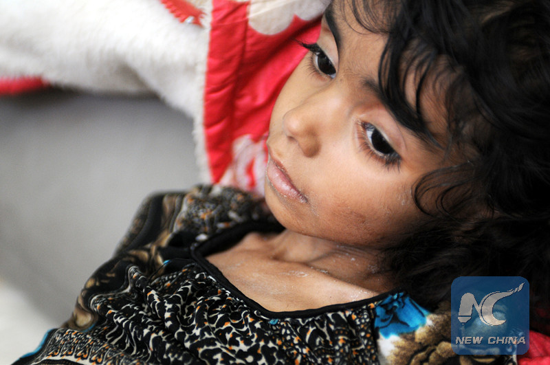 A Yemeni malnourished girl lies on a bed receives medical treatment at a hospital in Sanaa, Yemen, on May 05, 2018. (Xinhua/Mohammed Mohammed)