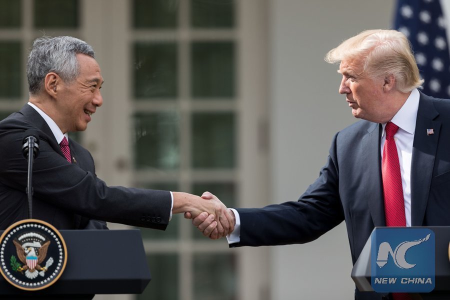 File Photo: U.S. President Donald Trump (R) shakes hands with visiting Singaporean Prime Minister Lee Hsien Loong as they deliver joint statements at the White House in Washington D.C., the United States, on Oct. 23, 2017. (Xinhua/Ting Shen)