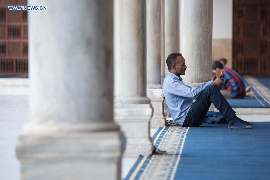 A Muslim reads the Koran at the Al-Azhar Mosque on the first day of the holy month of Ramadan in Cairo, Egypt, on May 17, 2018. (Xinhua/Meng Tao)