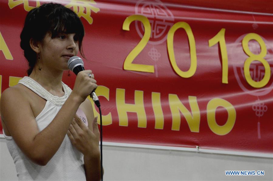 A student performs during the "Chinese Bridge Cuba 2018" competition at the University of Havana, in Havana, Cuba, on May 9, 2018. "Chinese Bridge Cuba 2018" competition took place on May 9 with students from the Confucius Institute of Havana demonstrating their language skills, as well as their knowledge of Chinese history and culture. (Xinhua/Joaquin Hernandez)