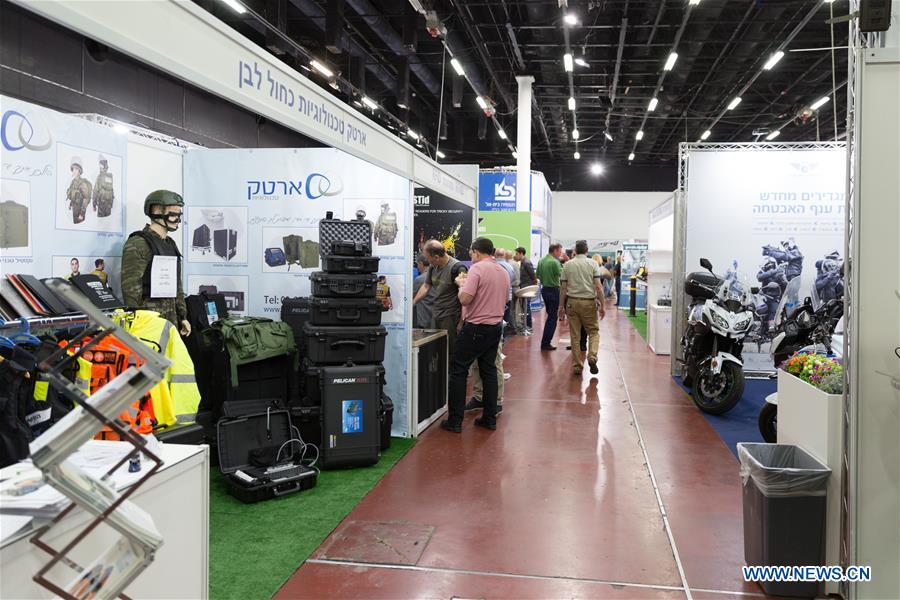 People visit the International Security & Defense Exhibition in Tel Aviv, Israel, on May 30, 2018. International Security & Defense Exhibition is part of the Israel Security & Defense Week which includes major exhibitions and specialized seminars, field demonstrations and workshops. (Xinhua/Guo Yu)