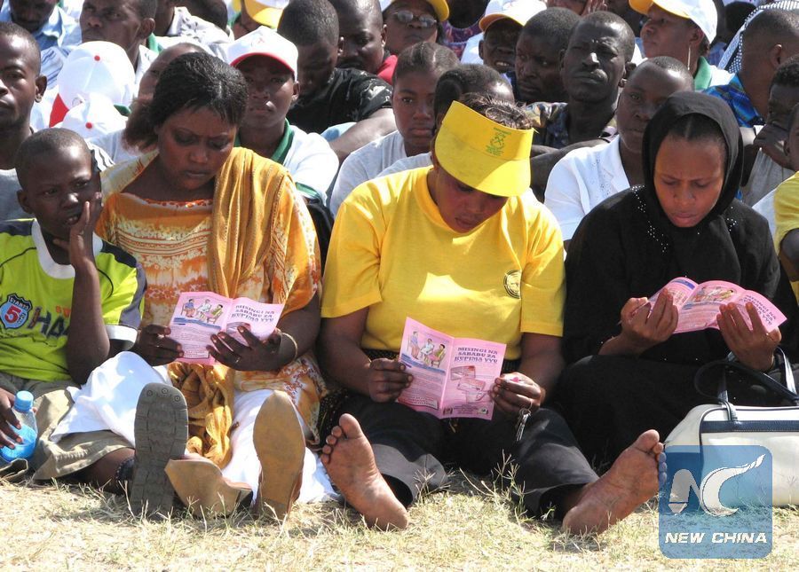 File photo shows Tanzanians read promotion pamphlets of preventing the spread of HIV/AIDS in the country during the ceremony to launch a nationwide voluntary blood testing forHIV/AIDS in Dar Es Salaam, capital of Tanzania, July 14, 2007. (Xinhua/Yi Gaochao)